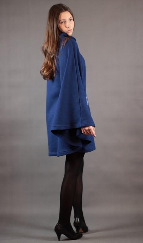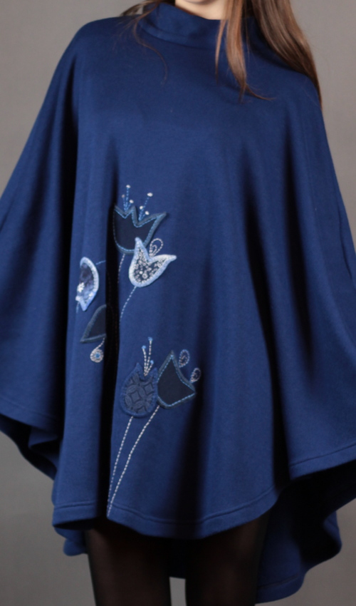 Zimní/jarní pončo modré barvy ze silné svetroviny s vlasem (chloupkem) na rubu, se stojáčkem u krku, s motivem modrých zvonků. Přední díl je zdobený aplikacemi modrých zvonků s ruční výšivkou. Délka zadního dílu od průkrčníku je cca 82 cm. Modelka je vysoká 169 cm.