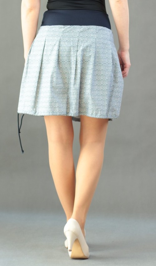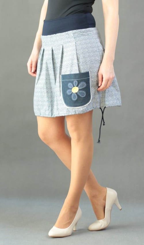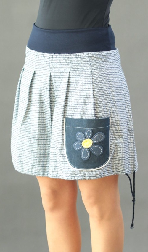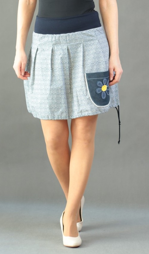 Modrobílá sukně naskládaná do pasu z nápletu tmavěmodré barvy, sklady jsou prošité cca do 5-6cm. Sukně má našitou malou kapsu, která je olemovaná bavlněným kedrem a ozdobená vyšívkou.