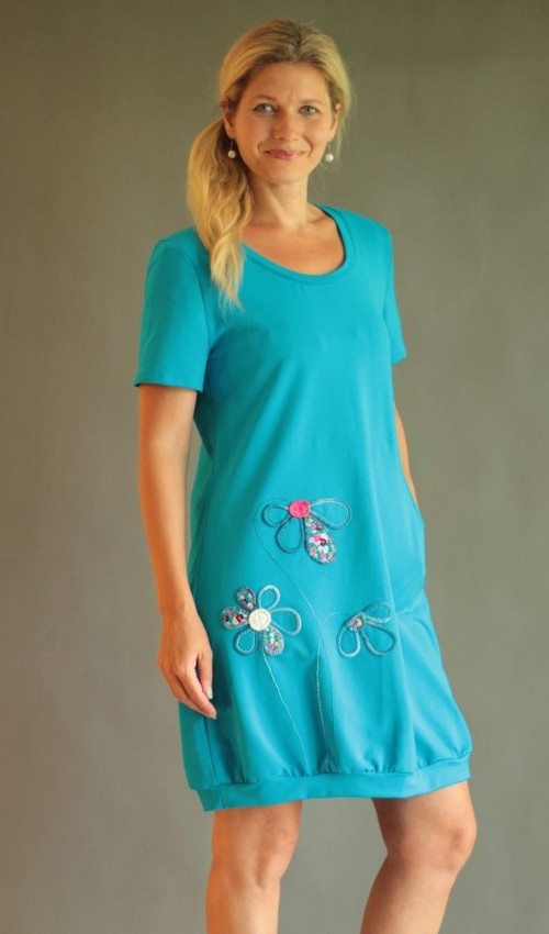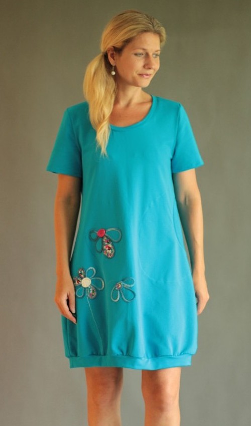 Volný střih s větším kulatým výstřihem, krátkým rukávem.