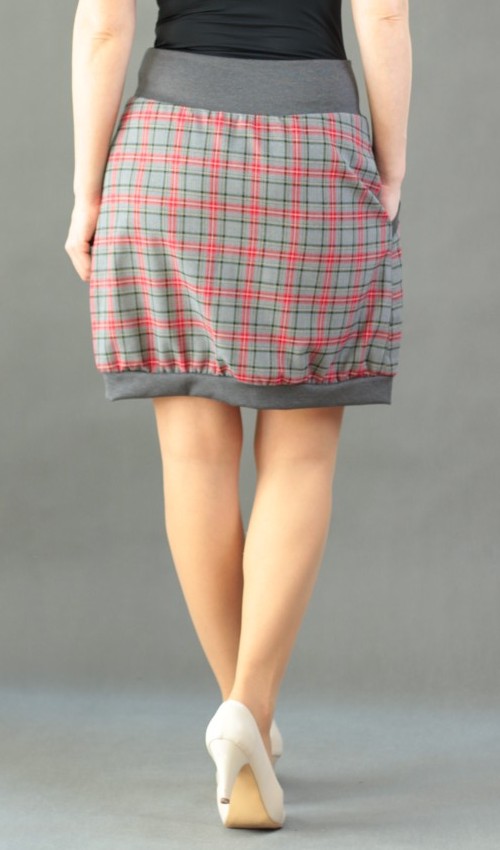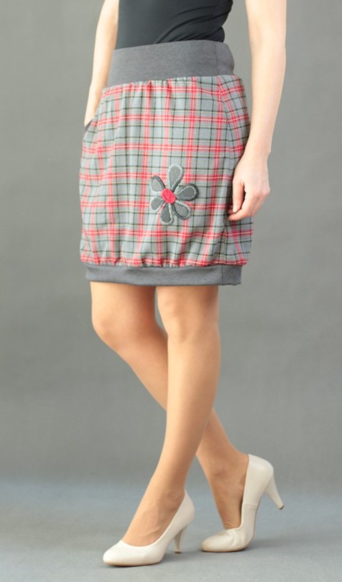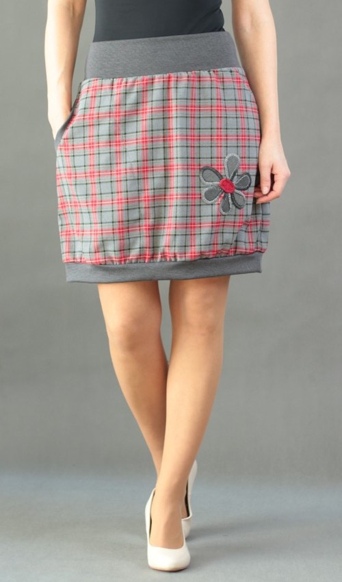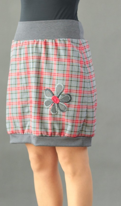Sukně je dole stažena do šedého nápletu.